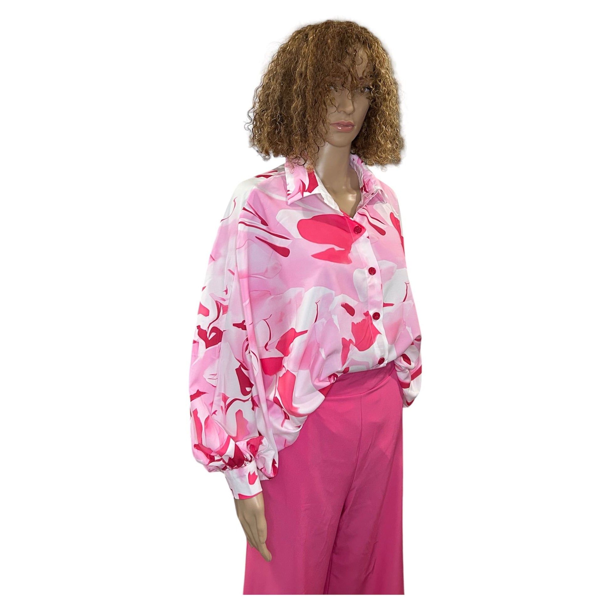 Make room for color. The Berry Melt Two-Piece brings bold energy into your fall wardrobe without sacrificing comfort. Cut from lightweight, fluid polyester, this set features an abstract berry-toned print that feels both playful and elevated. The voluminous shirt drapes effortlessly, while the wide-leg pants create movement with every step.