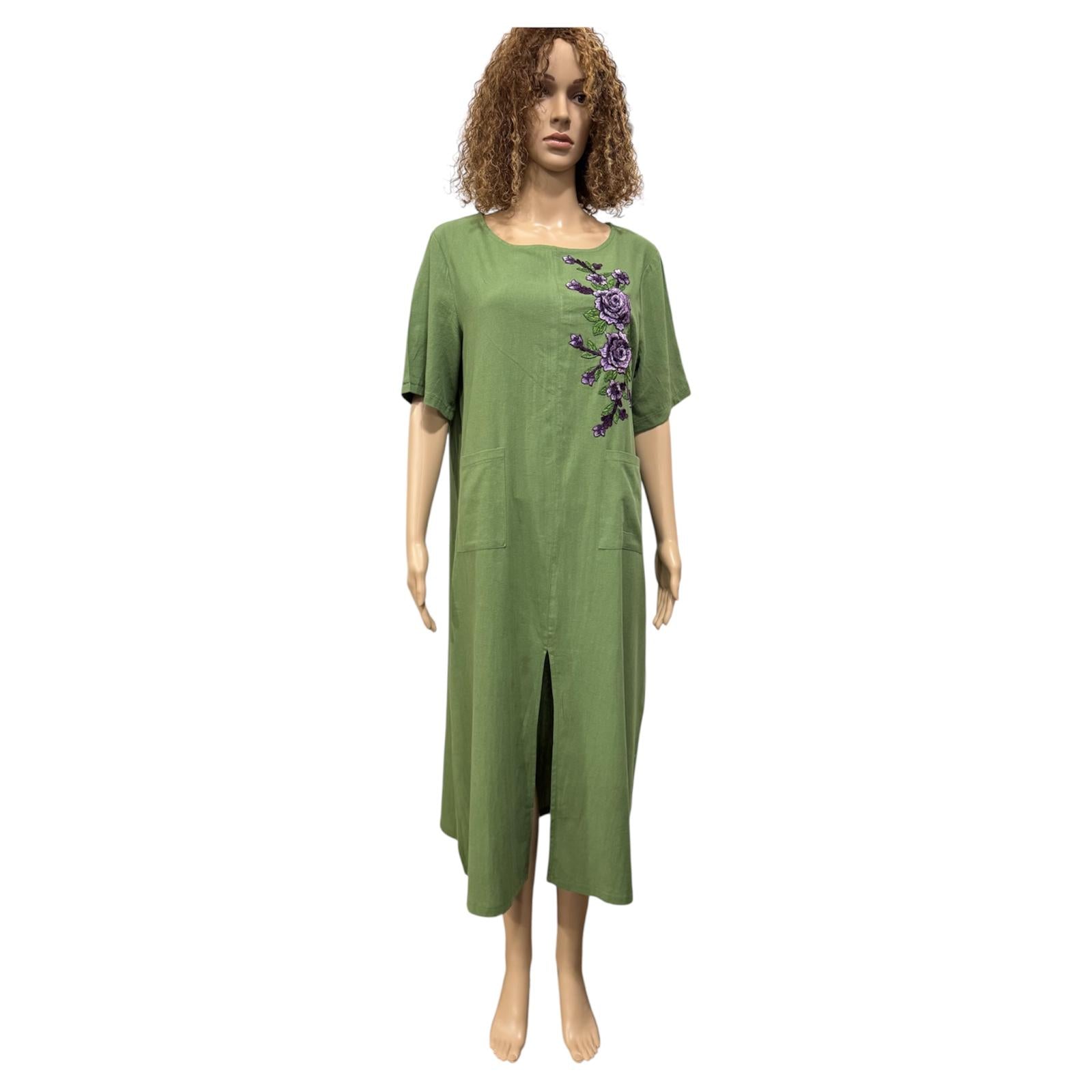 Effortless style meets everyday comfort, lightweight, breathable fabric, this relaxed-fit dress features a flattering midi length and a soft olive-green tone that complements every skin tone. The elegant floral embroidery on the chest adds a touch of femininity and charm, while the two front pockets bring both practicality and laid-back ease.
