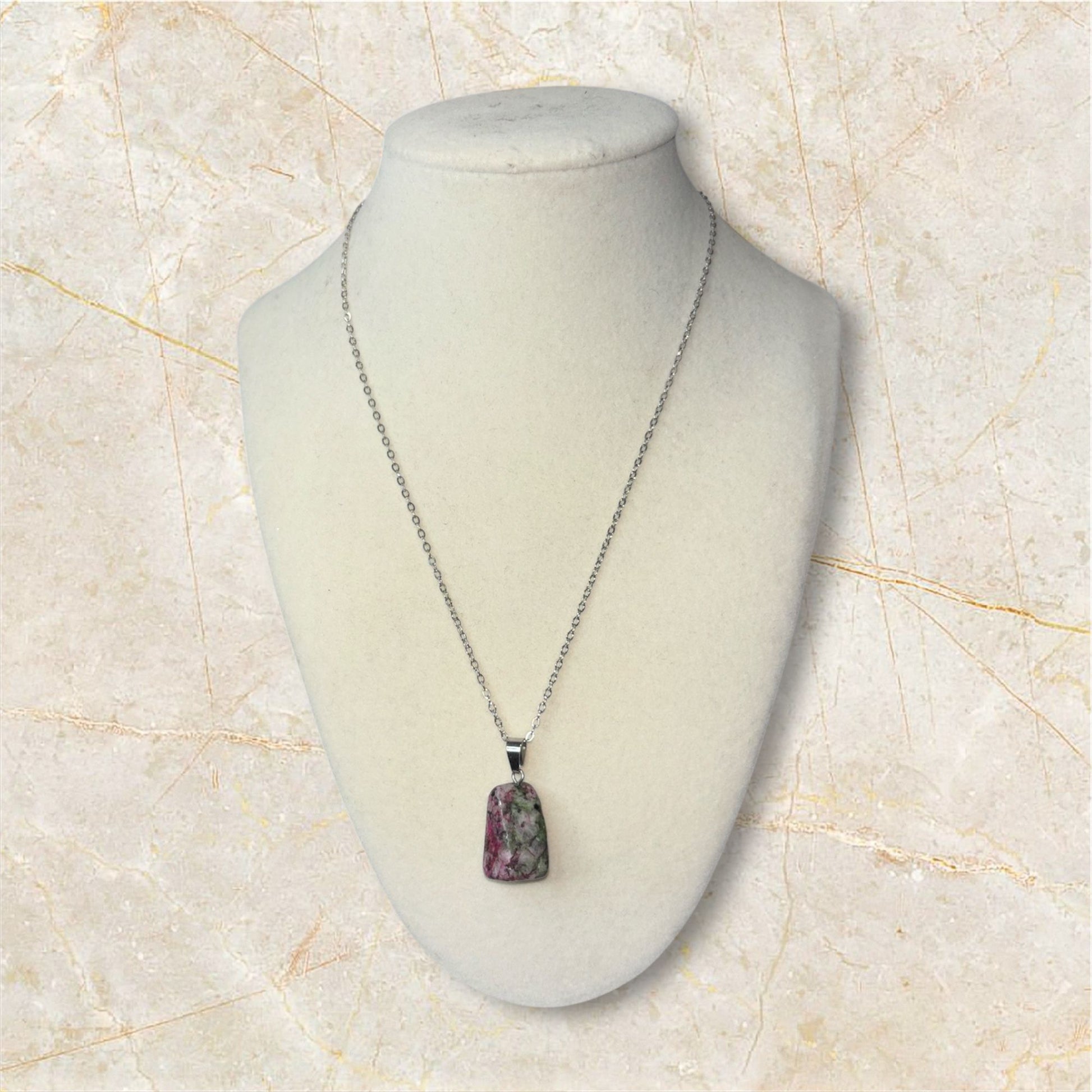 A unakite stone pendant blending soft rose pink with earthy green. Each piece carries a natural balance of colors, giving it a grounded yet delicate appeal.